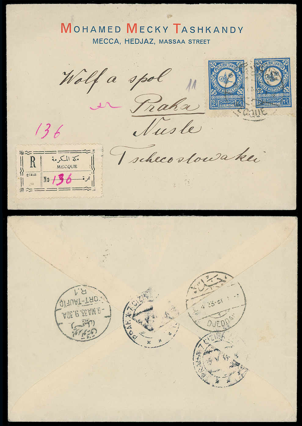1985 c, entire, etc. imageSaudi Arabia: Hejaz and Nejd: 1933 attractive registered cover to Prague franked by two singles 1932 21/4g blue (2) tied by Mecca double circle with registration label, backstamped transit and arrival datestamps. (Image1)