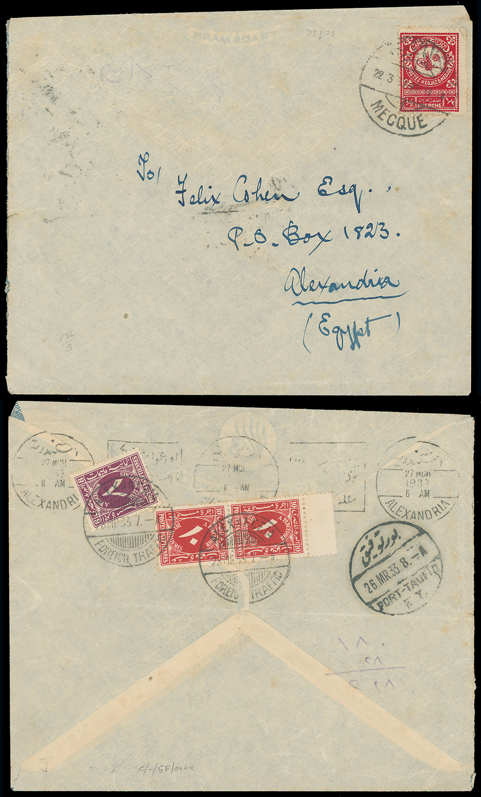 1986 c, entire, etc. imageSaudi Arabia: Hejaz and Nejd: 1933 (Mar. 22) envelope to Alexandria underpaid by 1932 1/2g. scarlet tied by Mecque c.d.s. with Egypt postage due 8m., 10m. pair cancelled by Alexandria Foreign Traffc c.d.s’s, very scarce. Photo. (Image1)