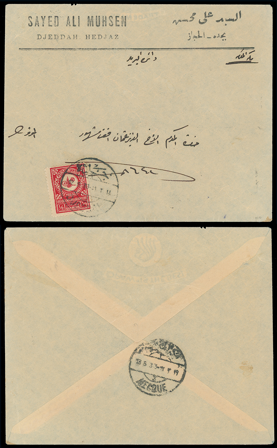 1987 c, entire, etc. imageSaudi Arabia: Hejaz and Nejd: 1933 (June 12) commercial cover from Jeddah to Mecca franked 1932 1/2g. scarlet tied by bilingual c.d.s. with arrival backstamp. (Image1)