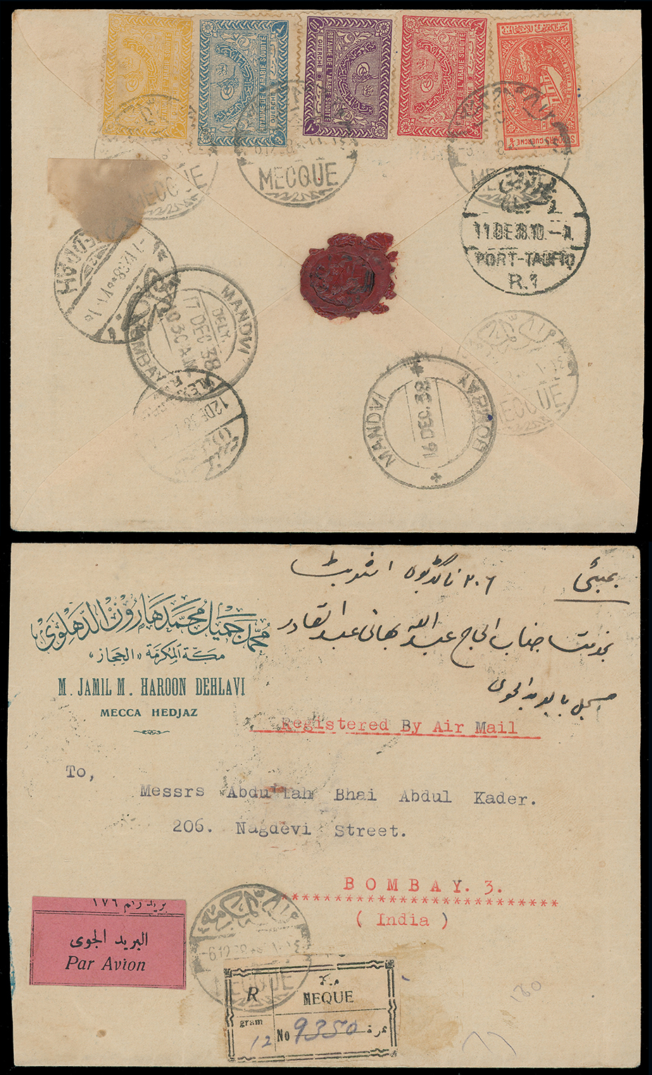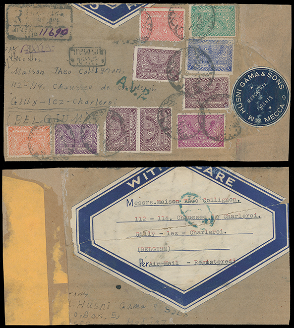 1997 c, entire, etc. imageSaudi Arabia: Kingdom of Saudi Arabia: 1938 (Dec. 6) envelope registered from Mecca to Bombay with registration and pink Par Avion labels, franked on reverse by 1934-57 1/8g. yellow, 1/2g. red, 3g. blue, 5g. orange and 1937 Charity Tax 1/8g. small format, tied by bilingual Mecque c.d.s’s with transit and Dec. 17 arrival datestamps. Photo. (Image1)
