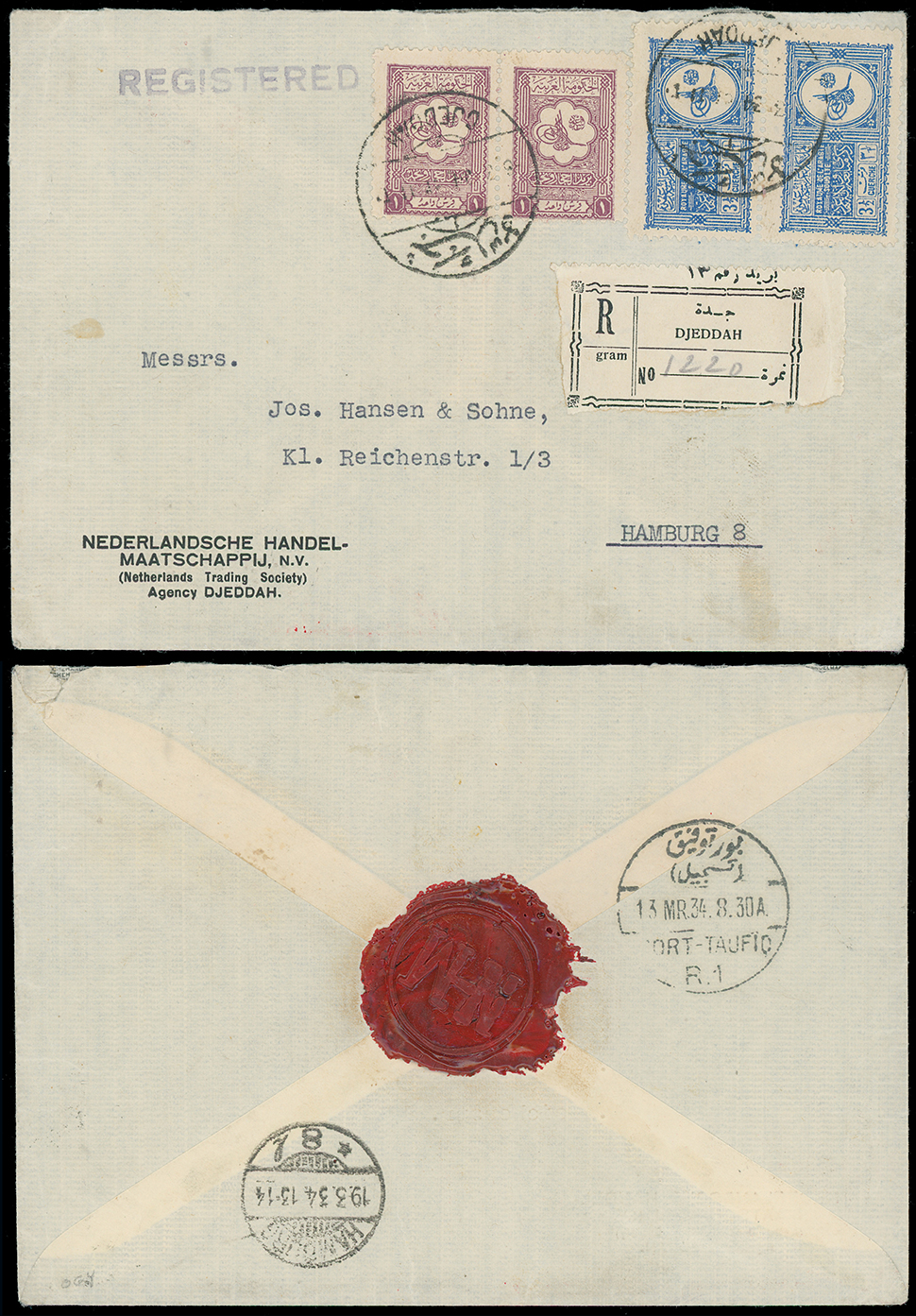 1991 c, entire, etc. imageSaudi Arabia: Kingdom of Saudi Arabia: 1934 (Mar. 6) Nederlandsche Handel-Maatcshappij envelope registered to Germany with registration label and franked by scarce combination of Hejaz & Nejd 1937 1pi. pair and Kingdom 1934 Proclamation 31/2g. pair,pair tied by Jeddah bilingual c.d.s’s with wax seal, Port-Taufiq transit and Hamburg Mar. 19 arrival on reverse. Photo. (Image1)