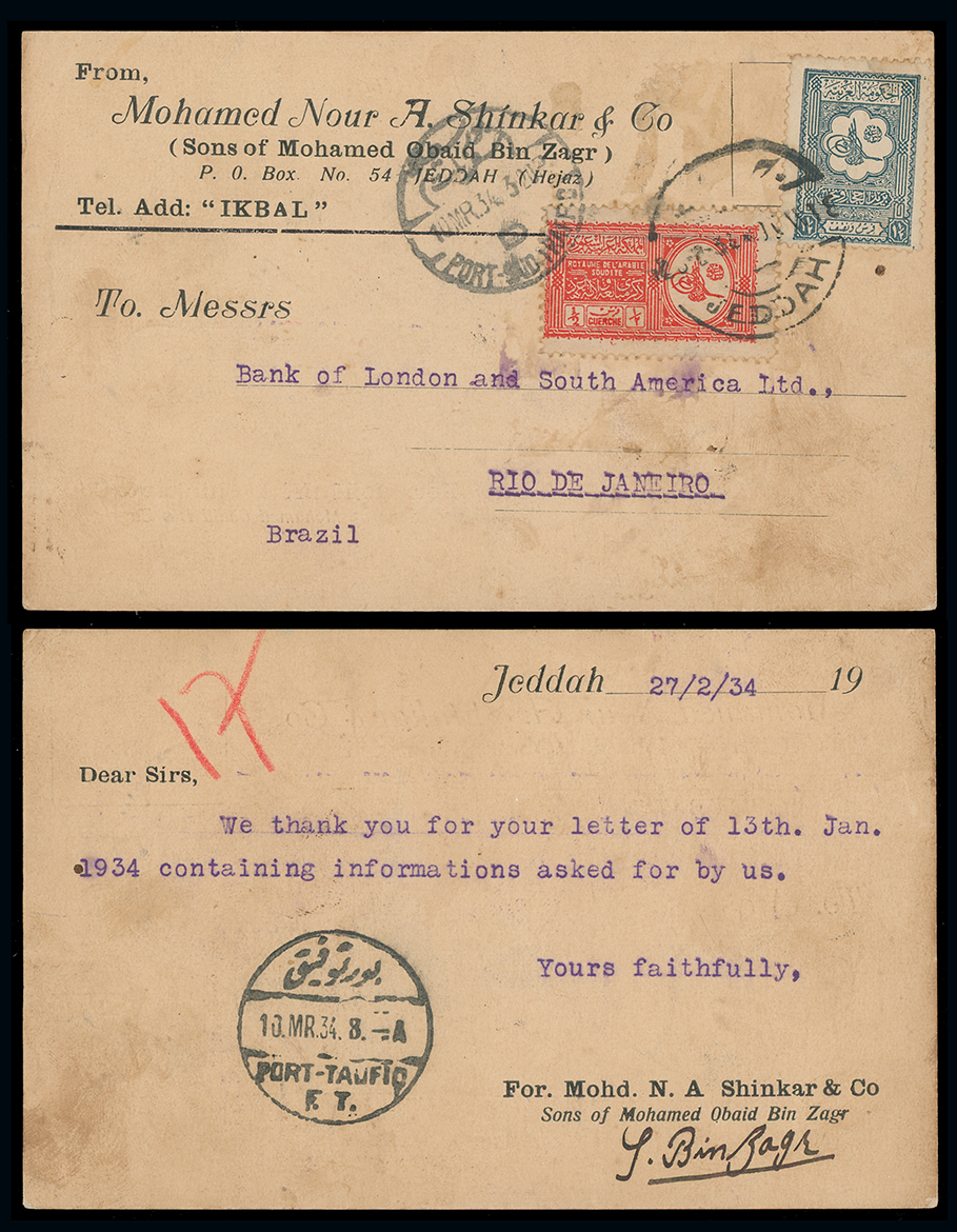 1990 c, entire, etc. imageSaudi Arabia: Kingdom of Saudi Arabia: 1934 (Feb. 27) postcard to Rio de Janeiro bearing 1927 11/2pi. blue and Kingdom 1934 Proclamation 1/2g. scarlet tied by Jeddah and Port Said mar. 10 c.d.s’s, with Port-Taufiq transit on reverse. (Image1)