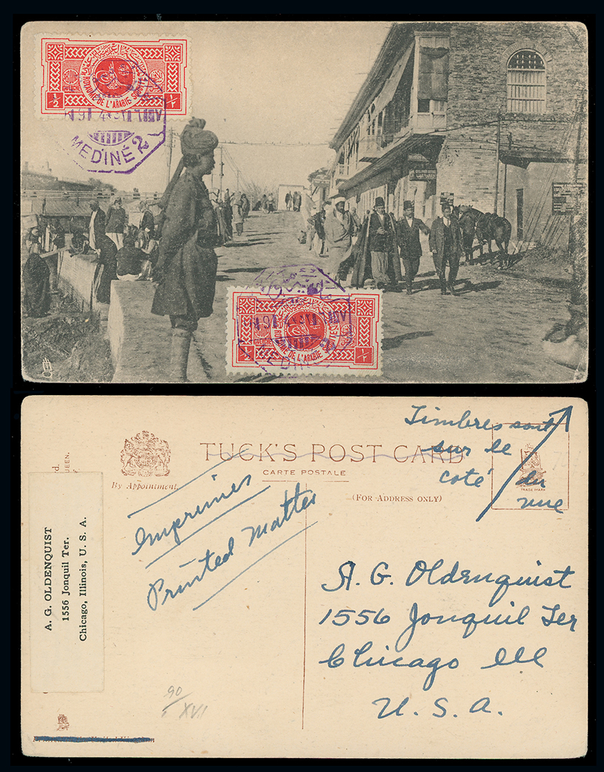 1992 c, entire, etc. imageSaudi Arabia: Kingdom of Saudi Arabia: 1934 (Sept. 16) picture postcard of central Medina sent to Chicago, endorsed “Printed Matter” franked on picture side by 1934 Charity Tax 1/2g. red (2) tied by violet octagonal Medina 2 datestamps. This the only known postcard showing the octagonal datestamp in violet. Photo. (Image1)