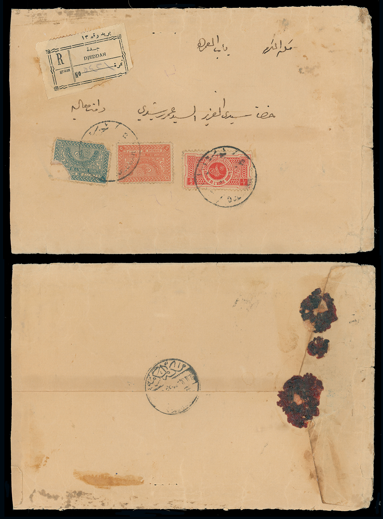 1989 c, entire, etc. imageSaudi Arabia: Kingdom of Saudi Arabia: 1934-57 1g. green-blue (defective), 5g orange, and Charity Tax 1/2g. scarlet used on internal cover, foreshortened at left, registered from Jeddah to Mecca with registration label and arrival backstamp, slight cover faults. (Image1)