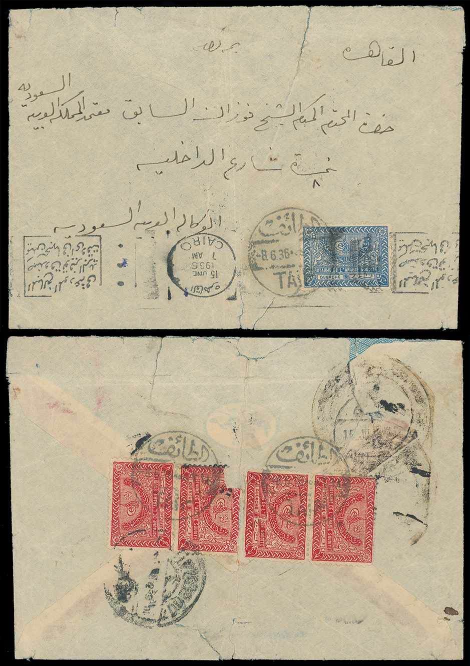 1993 c, entire, etc. imageSaudi Arabia: Kingdom of Saudi Arabia: 1936 envelope from Taif to the first Saudi Ambassador to Egypt, Fawzan Al Sabek in Cairo, via Jeddah and franked on reverse 1934 1/2g. red (4, one damaged) with 31/2g. new blue on obverse, all tied by Al Taif c.d.s’s with June 15 machine arrival, cover faults but an unusual franking. (Image1)