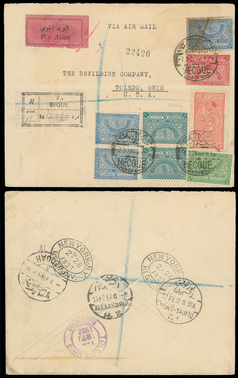 1994 c, entire, etc. imageSaudi Arabia: Kingdom of Saudi Arabia: 1937 (Feb. 7) colourful registered airmail cover to Toledo, Ohio bearing 1934-57 1/4g. green, 1/2g., 1g. pair, 31/2g. pair and single (defective) and 1936 Charity Tax 1/8g. large format tied by bilingual Mecca c.d.s’s, with registration and Par Avion labels, transit and arrival backstamps, scarce rate and combination of issues. Photo. (Image1)