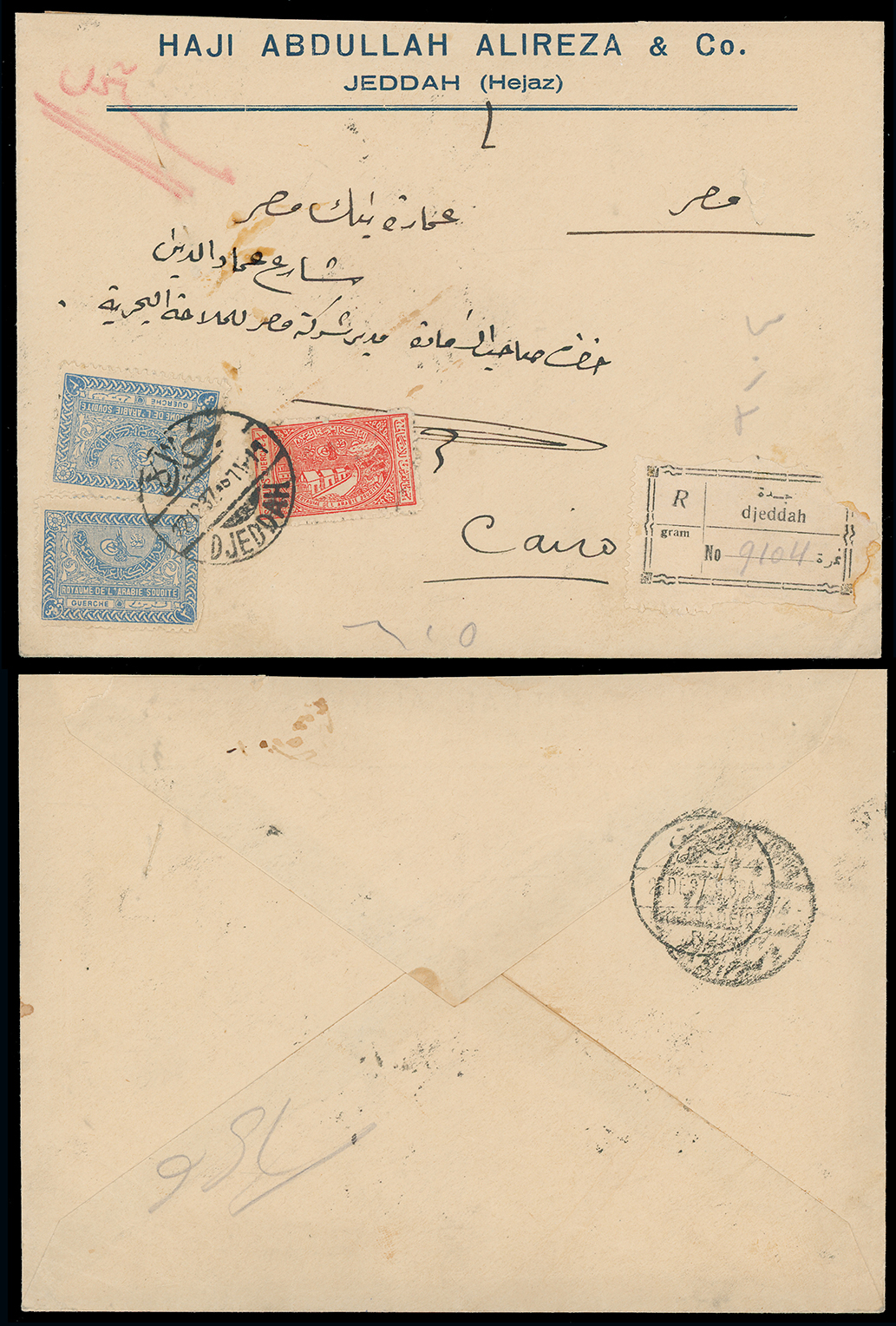 1995 c, entire, etc. imageSaudi Arabia: Kingdom of Saudi Arabia: 1937 (Dec. 22) registered cover from Jeddah to Cairo, franked by 1934-57 3g blue (2) and 1936 Charity Tax 1/8g. small format with fine Jeddah bilingual c.d.s. and registration label, arrival backstamp. (Image1)
