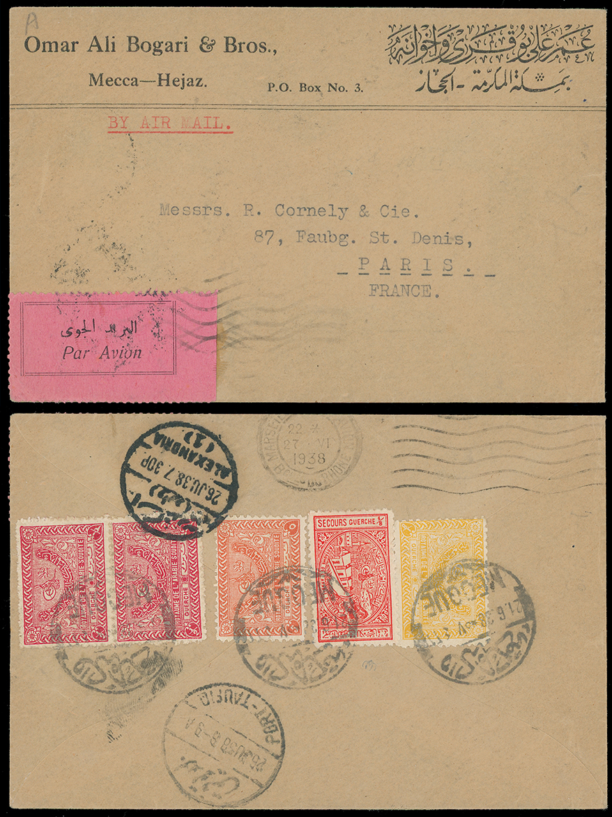 1996 c, entire, etc. imageSaudi Arabia: Kingdom of Saudi Arabia: 1938 (June 21) envelope to Paris with pink Par Avion label, franked on reverse by 1934-57 1/8g. yellow, 1/2g. red pair, 5g. orange and 1937 Charity Tax 1/8g. small format, tied by bilingual Mecque c.d.s’s and Alexandria transit, with Marseilles June 27 transit. (Image1)