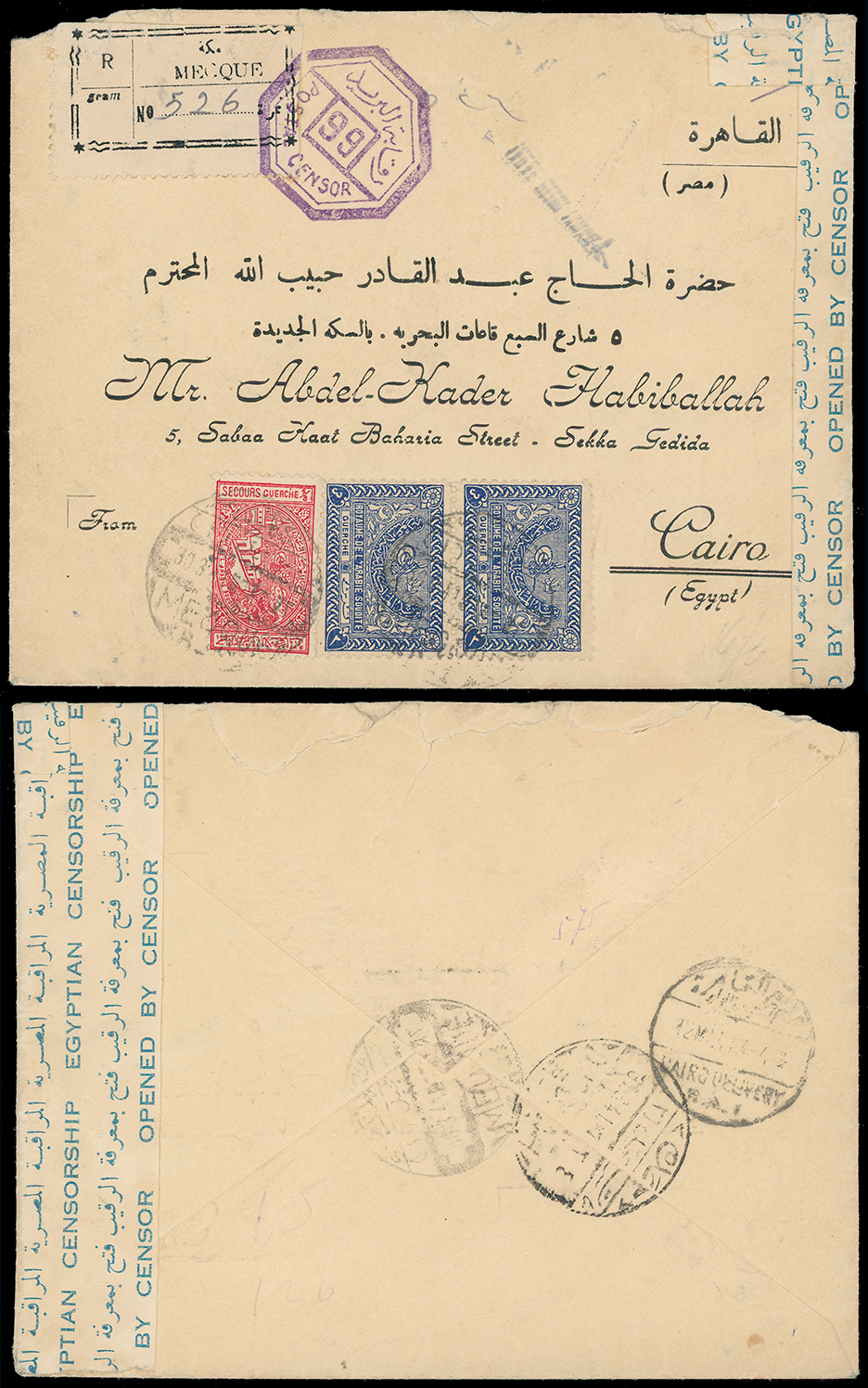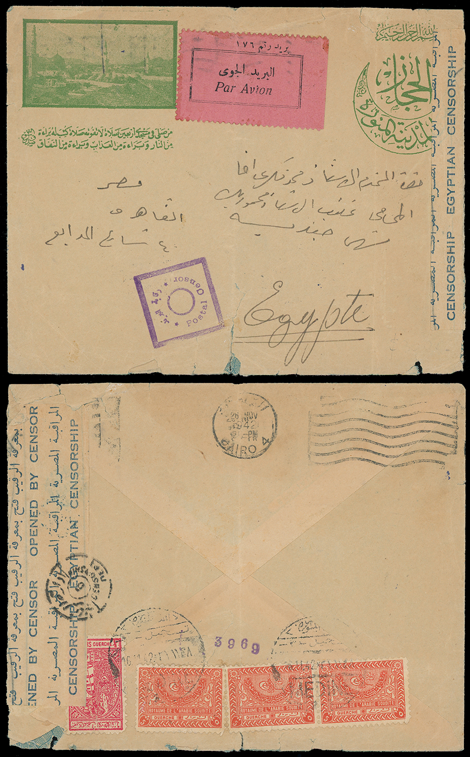 2000 c, entire, etc. imageSaudi Arabia: Kingdom of Saudi Arabia: 1942 (Nov. 16) censored airmail cover from Mecca to Cairo with pink “Par Avion” label, Egyptian square framed “Postal Censor” bilingual handstamp in violet and resealing tape, franked on reverse 1934-57 8g. pair and single with 1937-42 Charity Tax 1/8g. small format, some creasing. Photo. (Image1)