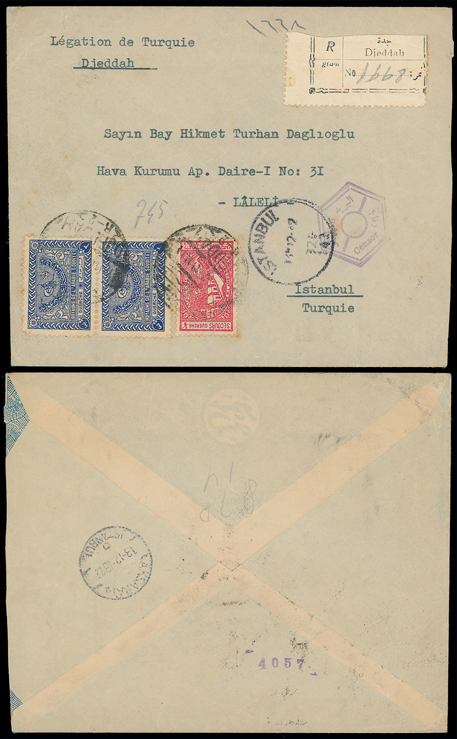 2001 c, entire, etc. imageSaudi Arabia: Kingdom of Saudi Arabia: 1942 (Dec.) censored registered cover to Istanbul with typed endorsement “Légation de Turquie/Djeddah” with hexagonal framed “Postal Censor” bilingual handstamp in violet, franked 1934-57 3g. pair and 1937-42 Charity Tax 1/8g. small format, with Jeddah c.d.s’s and registration label, Dec. 13 arrival backstamp. (Image1)