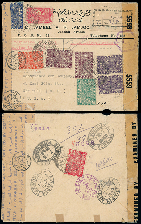2002 c, entire, etc. imageSaudi Arabia: Kingdom of Saudi Arabia: 1943 (May 1) twice censored registered cover to New York with Egyptian circular and hexagonal censor marks, Egyptian and U.S. resealing tape, six colour franking of 1934-57 1/2g. (on reverse), 1g., 3g., 5g., 10g. pair, 20g. (2) and 1937-42 Charity Tax 1/8g. small format, Jeddah c.d.s’ and registration label, July 8 arrival backstamp. Photo. (Image1)
