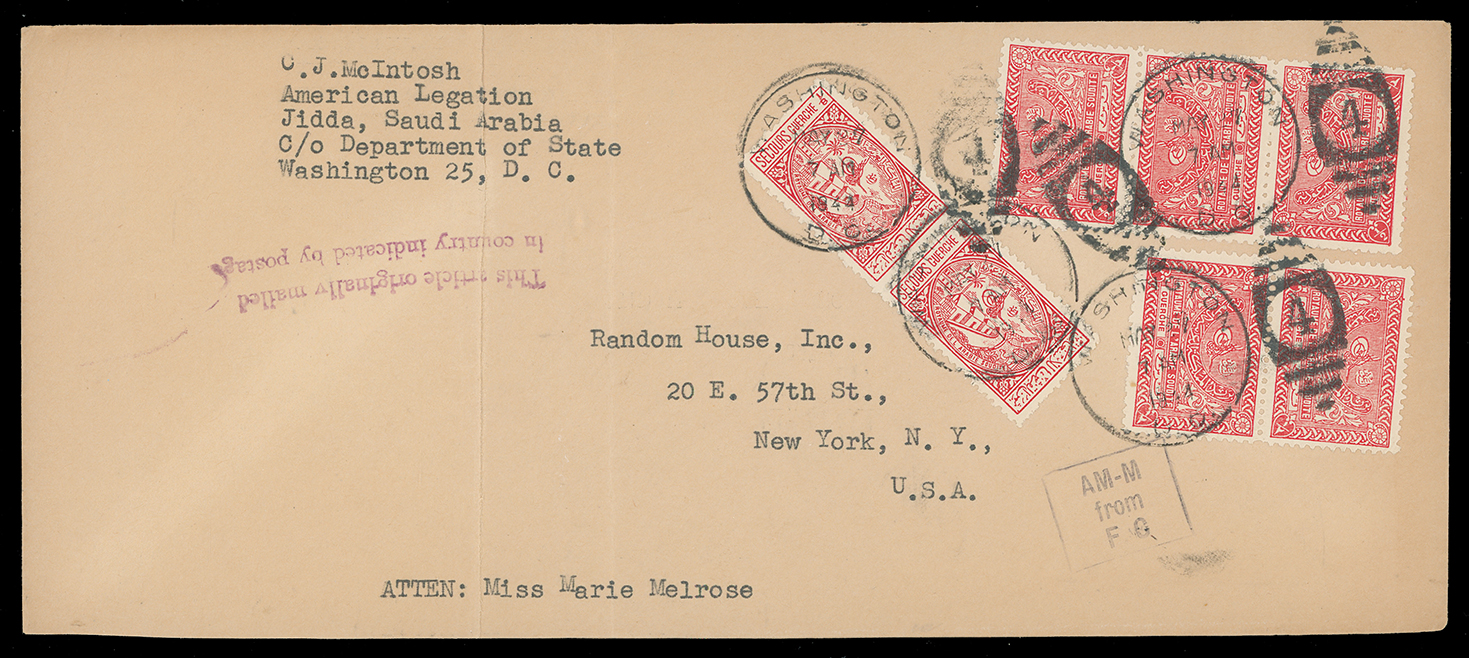 2003 c, entire, etc. imageSaudi Arabia: Kingdom of Saudi Arabia: 1944, unusual long envelope to New York from Clarence J. McIntosh at the American Legation in Jeddah (opened in 1942) bearing 1934-57 1g. pair and strip of three with 1937-42 Charity Tax 1/8g., small format, in rare pair cancelled by Washington May 27 duplexes and showing magenta two line “This article originally mailed/in country indicated by postage”, vertical fold at left well clear of adhesives. Photo. (Image1)