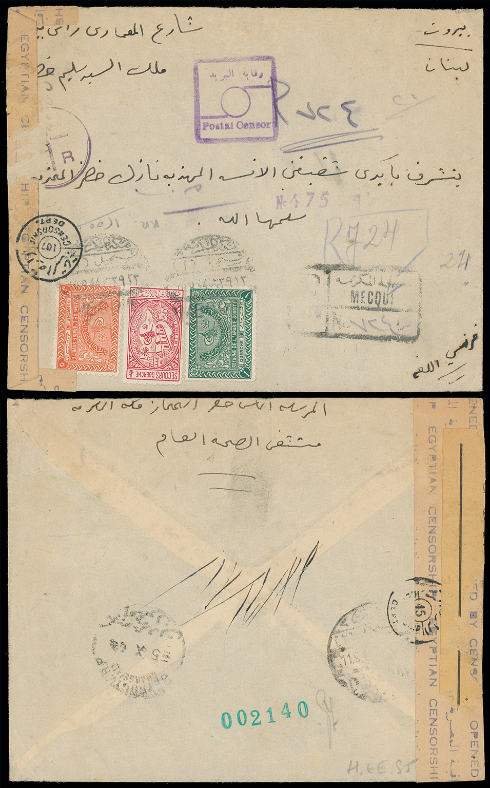 2004 c, entire, etc. imageSaudi Arabia: Kingdom of Saudi Arabia: 1944 (Sept. 10) censored cover to Beirut with Egyptian circular and square framed censor marks, resealing tape, franked 1934-57 1g. , 5g. and 1937-42 Charity Tax 1/8g., small format, Mecca c.d.s’s and registration handstamp. (Image1)