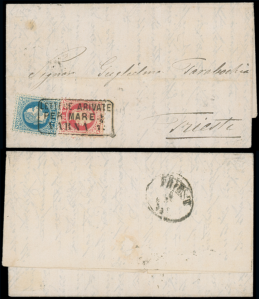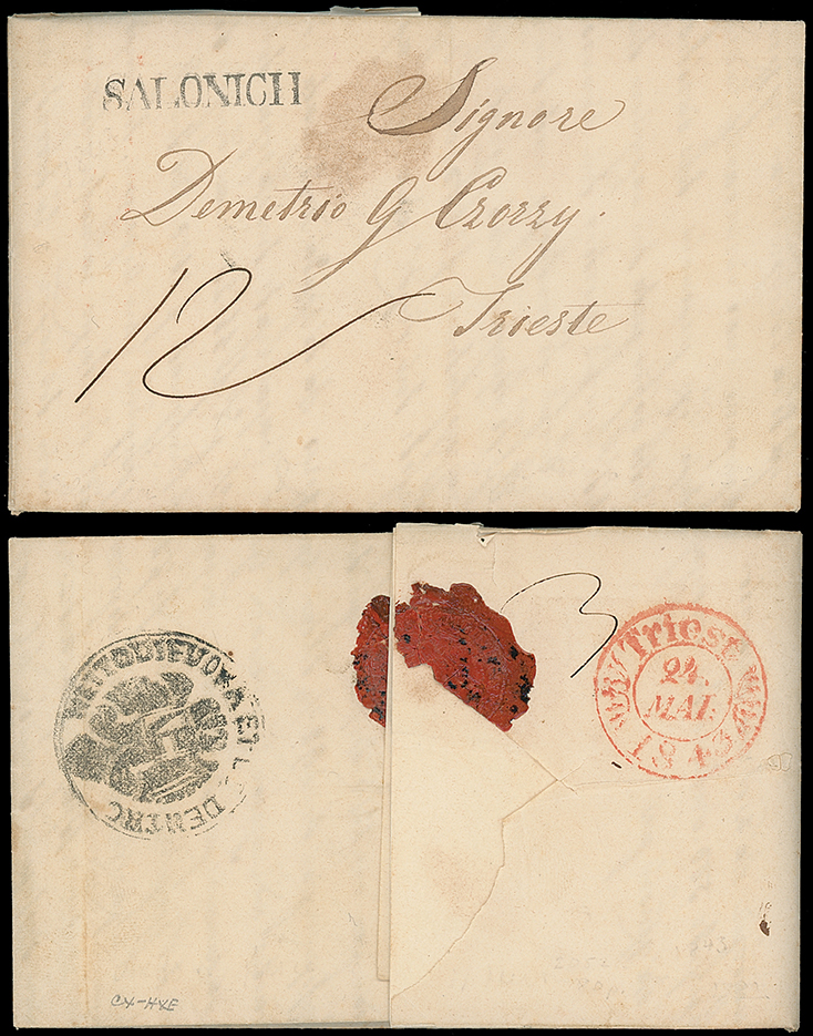 2163 c, entire, etc. imageTrieste: The Brian Asquith Collection: Incoming Mail: Austrian P.O’s. in Levant: Selection with 1841, 1843 entires with “SALONICH” straight line marks and Trieste double ring arrival c.d.s., the latter disinfected, 1861 wrapper with “SMIRNE” c.d.s. with ‘20’ kr charge notation, 1864 wrapper “Col Vapore” sent unpaid with “CONSTANTINOPEL” c.d.s. and Trieste framed datestamp on reverse and 1869 entire with “SMIRNE” thimble c.d.s. and small oval Trieste arrival datestamp, etc. (7) (Image1)