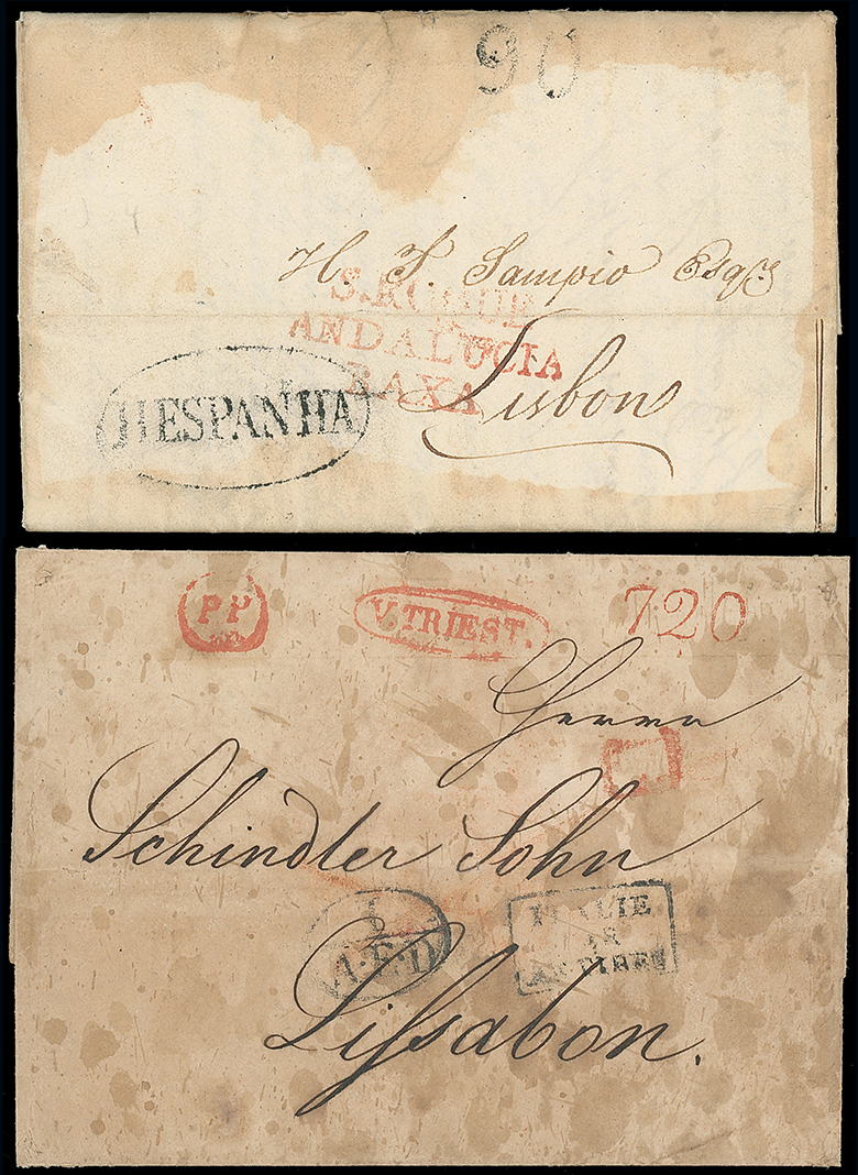 2145 c, entire, etc. imageTrieste: The Brian Asquith Collection: Disinfected Mail: 1818 (Mar. 21) entire (partly printed) to Lisbon with (90” reis charge mark and San Roque and oval “HESPANHA” transit marks and 1832 (Dec. 21) wrapper to Lisbon with oval “V.TRIEST”, circular “P.P.”, framed “ITALIE/PAR/ANTIBES” and “720” reis charge mark, both with distinct vinegar stains. (2) Photo. (Image1)