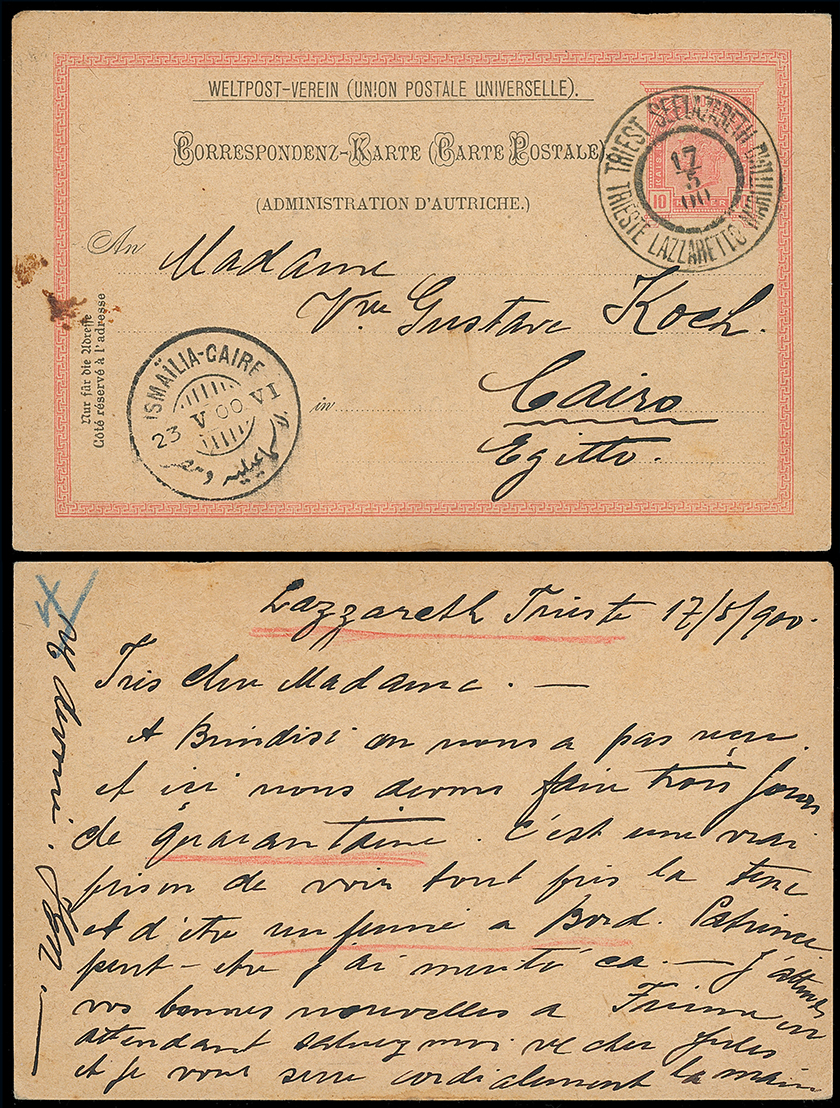 2147 c, entire, etc. imageTrieste: The Brian Asquith Collection: Disinfected Mail: 1900 (May 17) 10k. postcard to Cairo with message (in French) datelined at the Trieste Lazzaretto and cancelled with the double ring bilingual Trieste Lazzaretto c.d.s., very scarce. Photo. (Image1)