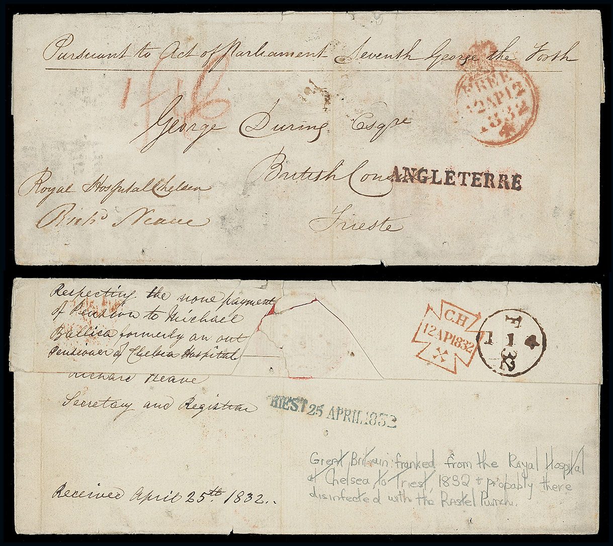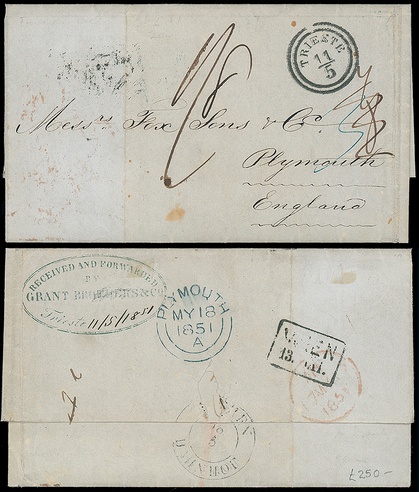 2150 c, entire, etc. imageTrieste: The Brian Asquith Collection: Foreign Destinations: Great Britain: Selection with 1827 entire to Guernsey with oval “V.TRIEST”, London Foreign Branch and rated ‘2/10’(d), 1836 entire to Birmingham with oval “V.TRIEST” and large Crown inspectors mark deleted and rated ‘2/2(d), 1853 unpaid entire to London from Trieste and rated ‘8’(d) with content in Arabic concerning property in Alexandria, etc. (6) (Image1)