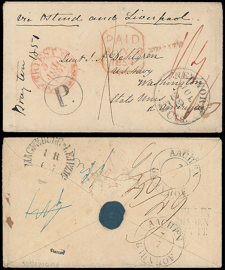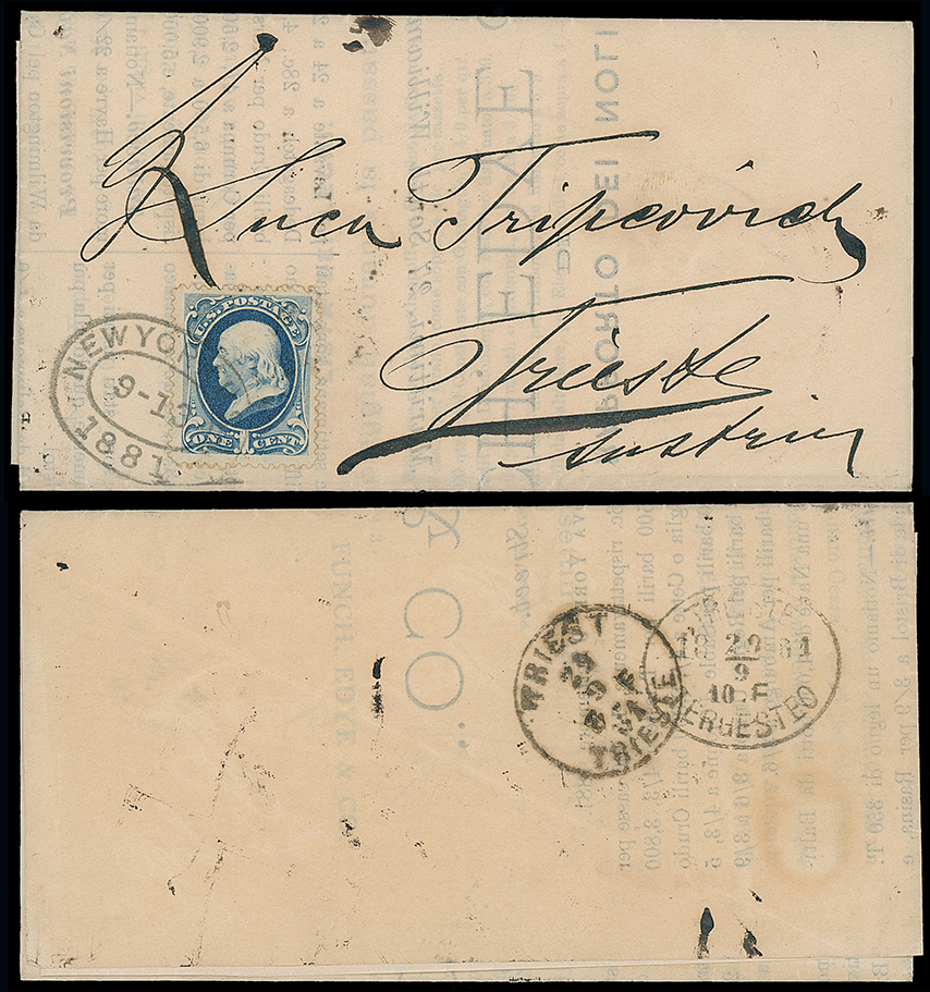 2159 c, entire, etc. imageTrieste: The Brian Asquith Collection: Foreign Destinations: United States of America: Selection incl. 1851 (July 5) envelope to Washington with Triest, London and New York datestamps, “FRANCO” and circular “P.” marks, charged ‘16’ cents and rated ‘49’ kr. on reverse (Ex Starnes), 1853 entire to Kingston, Mass. sent via Aachen and New York with framed “Paid/25cts.” and ‘half-moon’ “Americ./Packet.” mark and 1854 wrapper to the Austrian Consul in New York sent via Aachen and with ‘half-moon’ “BRIT:/Packet.” mark, fine. (3) Photo. (Image1)