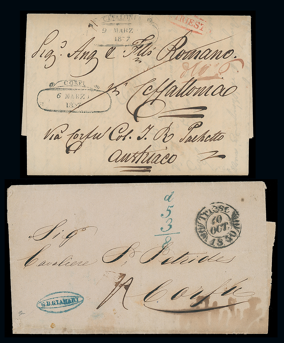 2152 c, entire, etc. imageTrieste: The Brian Asquith Collection: Foreign Destinations: Ionian Islands: 1837 entire to Cephalonia with part oval “V.TRIEST” and Corfu transit and Cephalonia arrival datestamps and 1850 (Oct. 10) entire (light stains) to Corfu with Triest and Corfu datestamps, sent unpaid with very scarce “d/5/3/8” accountancy mark applied and rated ‘4’ on reverse and ‘1/-’ in total. (2) Photo. (Image1)