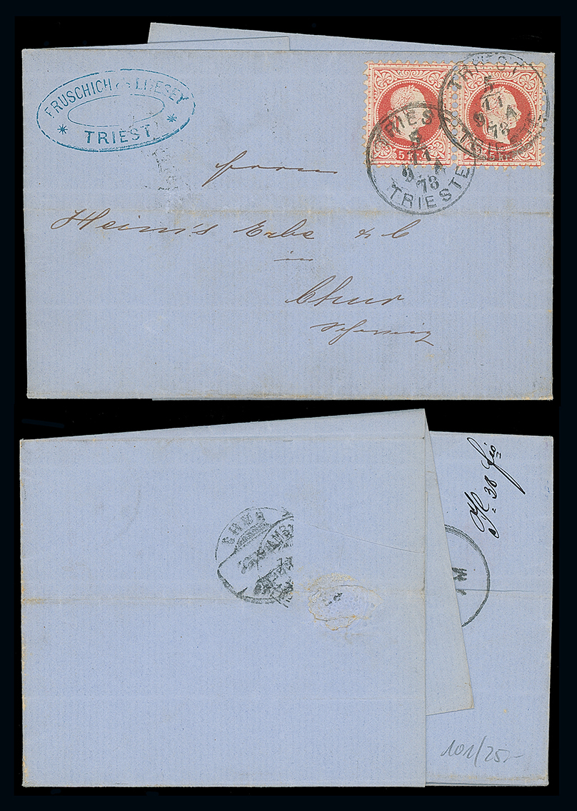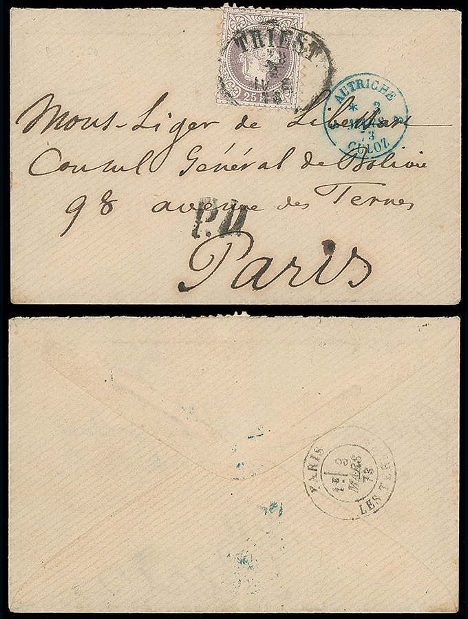 2149 c, entire, etc. imageTrieste: The Brian Asquith Collection: Foreign Destinations: France: Selection with 1775 entire to Marseilles with “D/AUTRICJE” mark, 1842 entire to Paris with Triest c.d.s. and framed “L.I.” (Lettre Italiane) mark, 1860 unpaid entire to Paris charged “8” decimes with incorrect “PORTUGAL” Paris Foreign Branch c.d.s. applied 1872 entire to Bordeaux franked 10kr. and 15kr. tied by oval Trieste datestamp, 1873 envelope to Paris franked 25kr. with “AUTRICHES/CULOZ” c.d.s., 1873 5kr. envelope to Marseilles uprated 5kr. and 15kr., etc. (16) (Image1)
