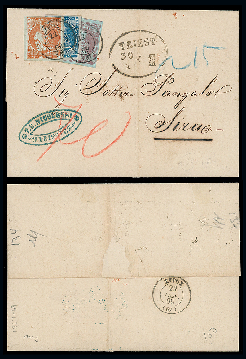 2151 c, entire, etc. imageTrieste: The Brian Asquith Collection: Foreign Destinations: Greece: Selection with 1845 wrapper “Col Vapoie del Lloyd Austro.” to Athens rated ‘29’kr., 1869 unpaid wrappers to Syra or Athens each with 10l., 20l. and 40l. three frankings applied for postage due, 1873 unpaid wrapper to Patras with oval Triest datestamp and 10l. tied by dotted diamond cancellation, etc. (5) Photo. (Image1)