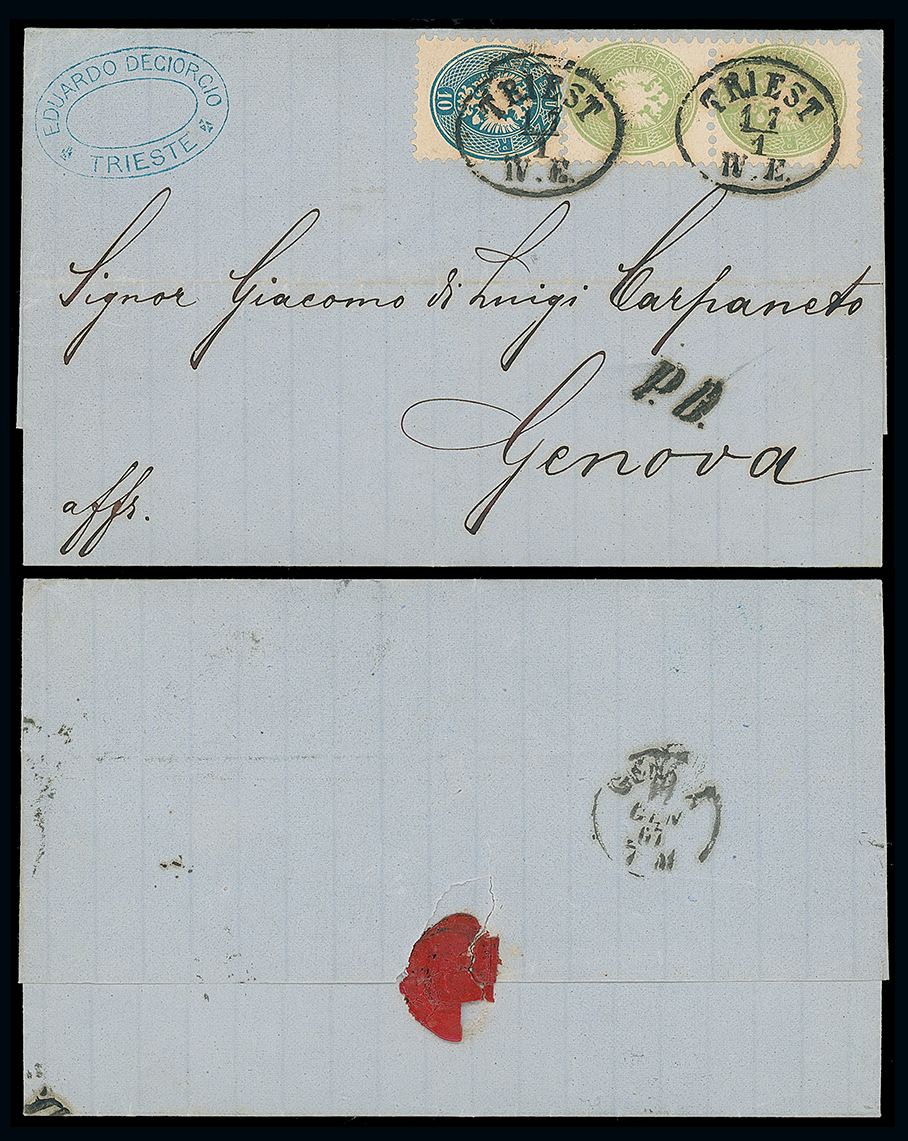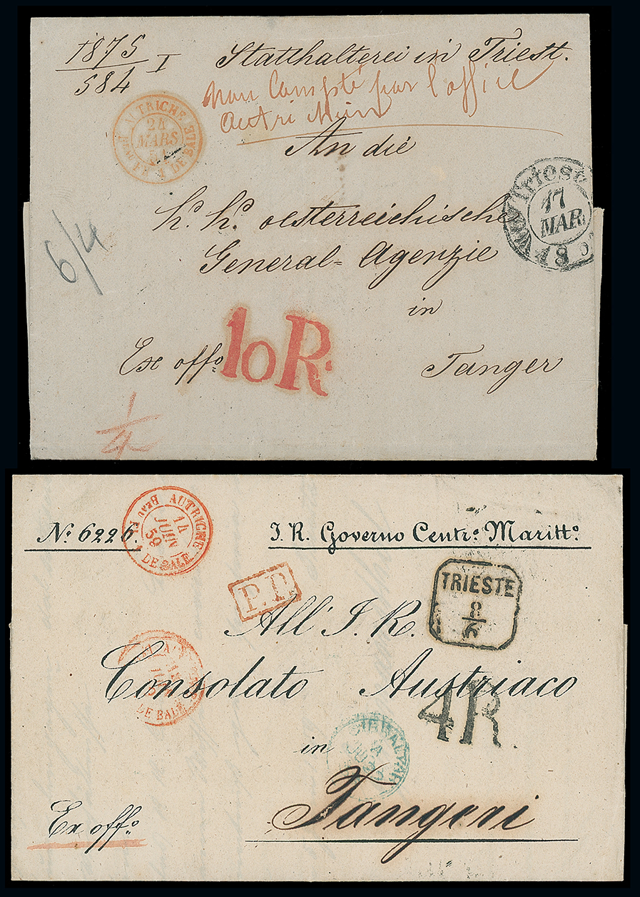 2156 c, entire, etc. imageTrieste: The Brian Asquith Collection: Foreign Destinations: Spanish Morocco: 1851 (Mar. 17) official entire to Tanger with Triest double ring c.d.s., “AUTRICHE/BEAU FR 1 BALE”, Bayonne and San Roque transit datestamp and large embossed wafer seal, 1859 similar example with Trieste framed datestamp, “4R” charge and framed “P.P.” marks and Gibraltar transit c.d.s. on reverse, also 1882 cover to Algeria franked 5kr. tied by oval Trieste datestamp. (3) Photo. (Image1)
