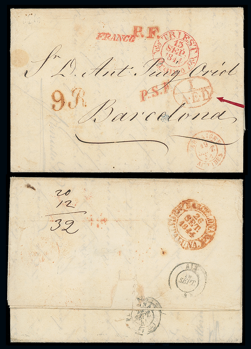 2155 c, entire, etc. imageTrieste: The Brian Asquith Collection: Foreign Destinations: Spain: 1844 (Sept. 13) entire to Barcelona prepaid ‘32’ kr. with Trieste double ring c.d.s, “FRANCO“, “P.S.F” oval “I/A.E.D”. “P.F.”, “FRANCO” and “9R” charge marks also Aix and “SARDAIGNE/ANTIBES” double ring transit c.d.s. and a Barcelona arrival c.d.s., scarce destination, fine. Photo. (Image1)