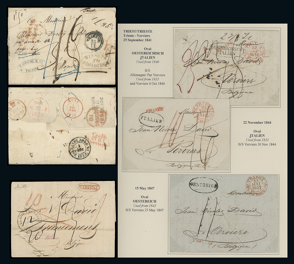 2148 c, entire, etc. imageTrieste: The Brian Asquith Collection: Foreign Destinations: Belgium: 1835 entire to Francomont with short oval “V.TRIEST” and double ring “AUSLAGE VON REGENSBURG” transit mark, 1841-47 entires to Verviers with double ring Trieste c.d.s. with oval “OESTEICHISCH/JTALIEN” (spelling error), “ITALIEN” or “OESTEREICH” transit marks and 1852 entire to Mons with Trieste double ring, London, Edinburgh, Cologne-Verviers T.P.O and a framed “MISSENT/TO/EDINBURGH” mark, fine. (5) Photo. (Image1)
