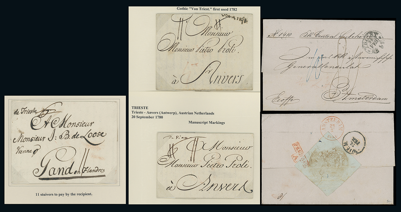 2154 c, entire, etc. imageTrieste: The Brian Asquith Collection: Foreign Destinations: Netherlands: 1780, 1784 entires to Antwerp datelined at Triest, the first endorsed “de Vien” and other with a “von Triest.” mark introduced two years earlier, 1782 entire to Ghent endorsed “de Trieste” and rated ‘11’ stuivers and 1851 official entire to Amsterdam endorsed “Escoffo” (Express) at lower left with large embossed wafer seal on reverse with Trieste, Vienna and Amsterdam c.d.s., fine. (4) Photo. (Image1)