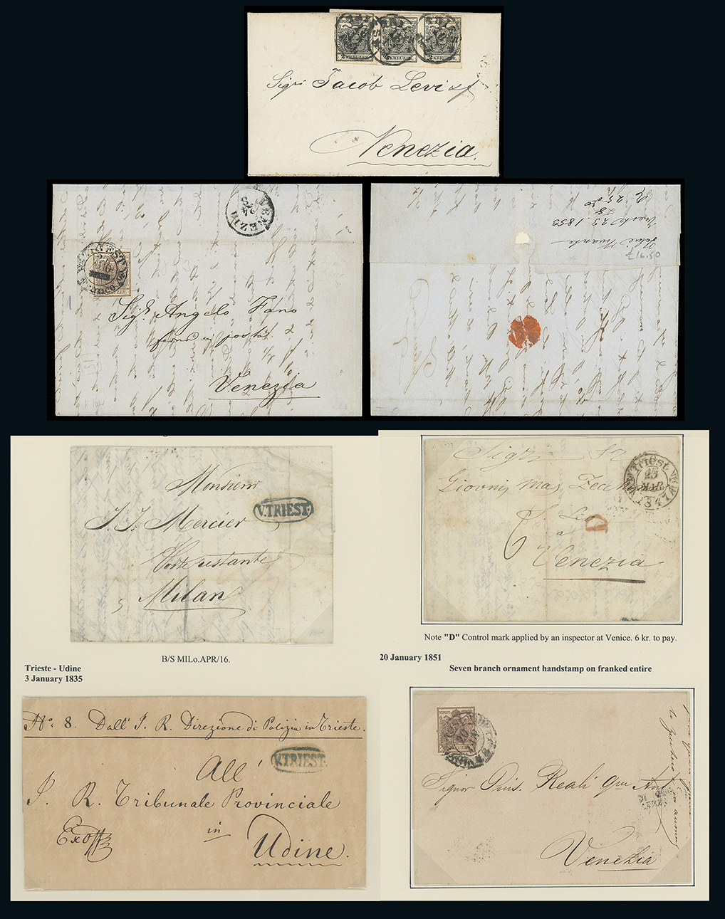 2160 c, entire, etc. imageTrieste: The Brian Asquith Collection: Foreign Destinations: Venetia-Lombardy (Austrian Italy): 1832, 1835 entires to Milan or Udine with oval “V/TRIEST” marks, 1847 entire to Venice with “D” inspectors mark and rated ‘6’kr., 1851 entire to Venice franked 6kr. tied by seven branch ornamental Triest c.d.s., 1853 entire to Venice franked 6kr. tied by the same c.d.s. with a bold bar under the date segment, 1858 entire to Venice franked 2kr. strip of three tied by Triest c.d.s. (6) Photo. (Image1)