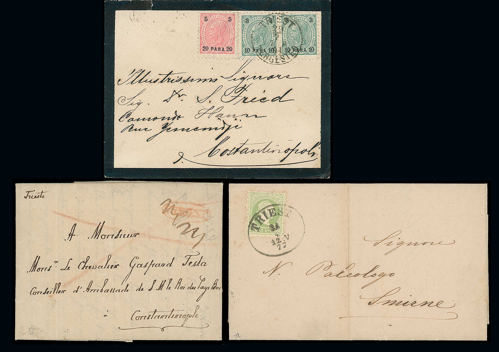 2158 c, entire, etc. imageTrieste: The Brian Asquith Collection: Foreign Destinations: Turkey: 1826 entire to Constantinople with oval “V.TRIEST” mark, 1877 printed matter entire to Smyrna franked 3kr. tied by oval Trieste datestamp and 1891 envelope to Constantinople franked 10pa. (2) and 20pa. Levant issues tied by Triest c.d.s. (3) Photo. (Image1)