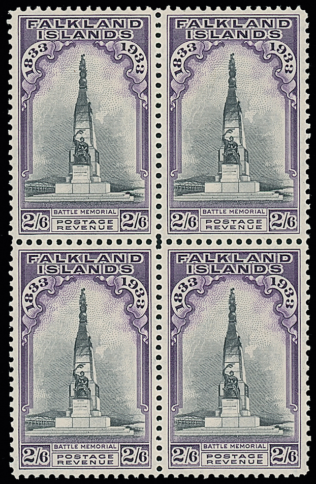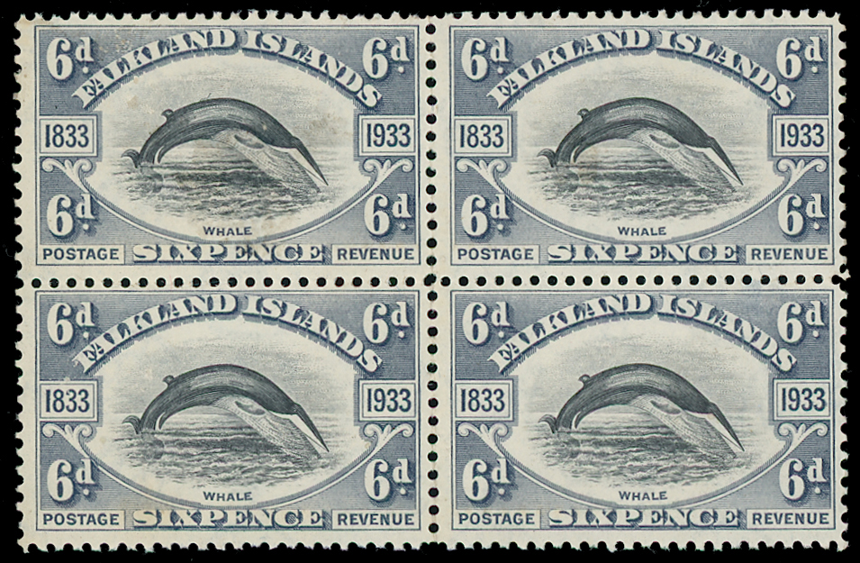 Falkland Islands: 1933 Centenary 6d. block of four, unmounted mint with some offset adhesions on gum otherwise fine. S.G. 133, cat. £320. (Image1)
