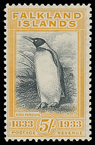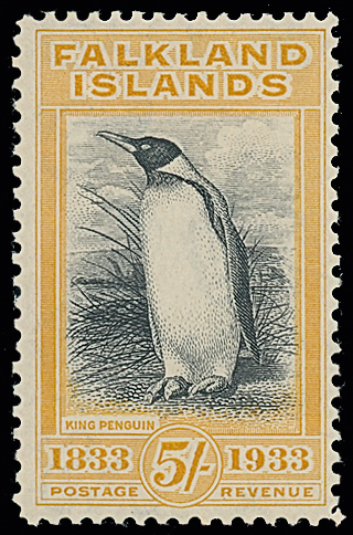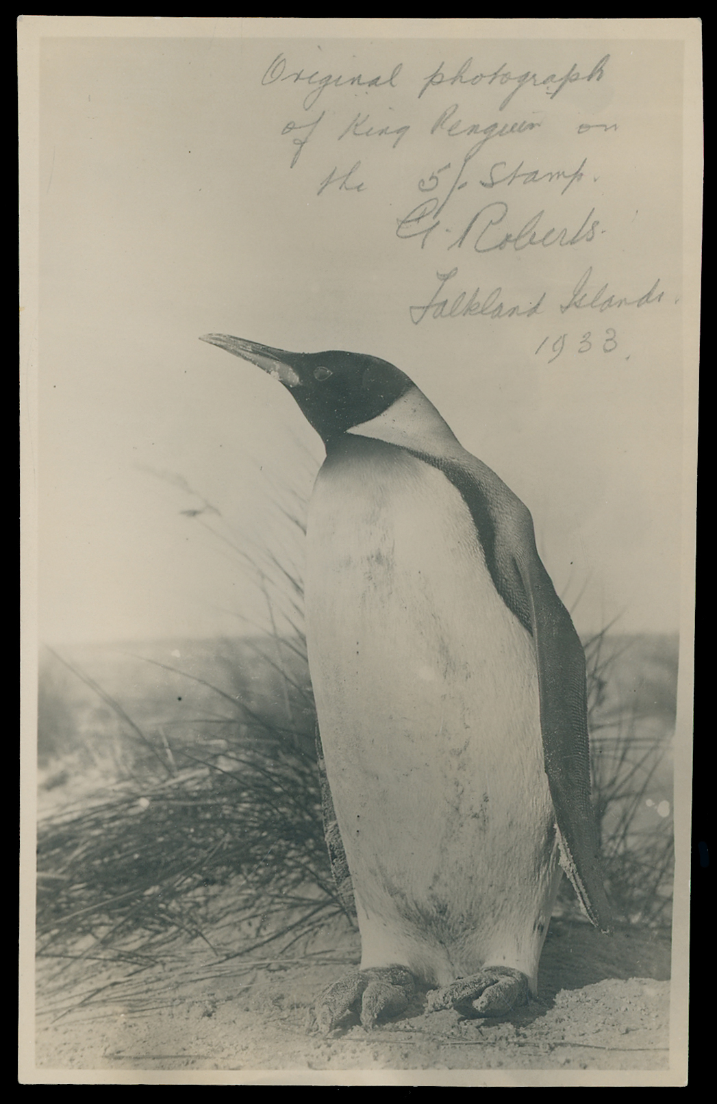 Falkland Islands: 1933 Centenary, real photographic postcard endorsed on picture side “Original photograph/of King Penguin on/the 5/- stamp/G. Roberts/Falkland Islands/1933”, the photograph having been taken by