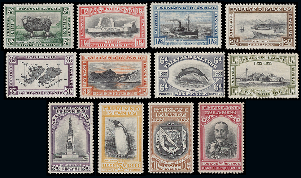 Falkland Islands: 1933 Centenary 1/2d. to £1 set, mint, £1 with some gum toning otherwise fine, fresh colours. (12) S.G. 127-138, cat. £4,250. Photo. (Image1)