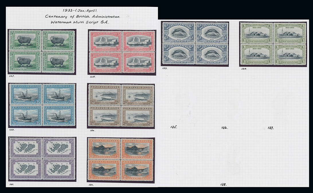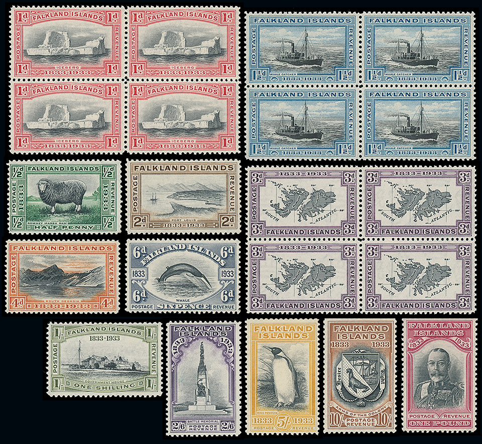 Falkland Islands: 1933 Centenary 1/2d. to £1 set, mint, 1d., 11/2d. and 3d. in blocks of four, some light gum toning but mainly fine. (21) S.G. 127-138, cat. £4,250. Photo. (Image1)