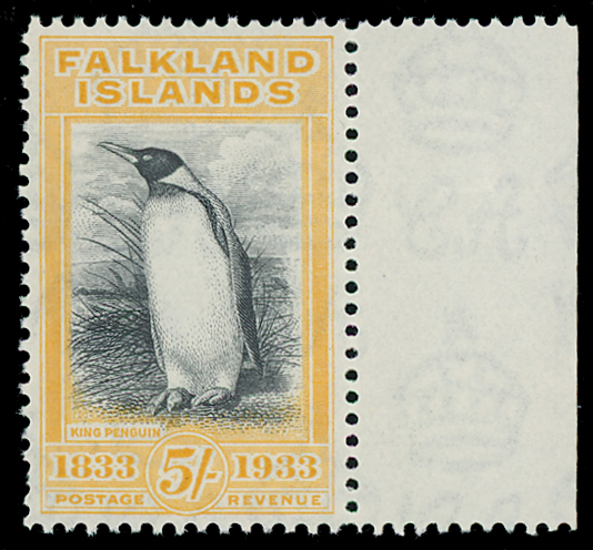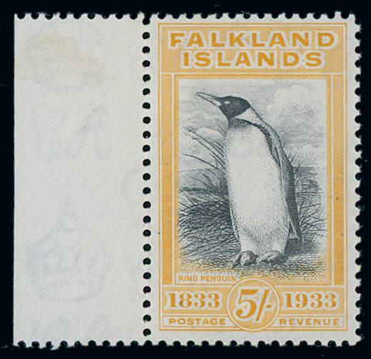 Falkland Islands: 1933 Centenary 5s. black and yellow, marginal at left, fine unmounted mint. S.G. 136, cat. £1,000. Photo. (Image1)