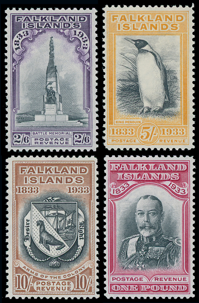 Falkland Islands: 1933 Centenary 2s.6d., 5s., 10s. and £1 unmounted mint, odd minor bend otherwise fine. (4) S.G. 135-38. (Image1)