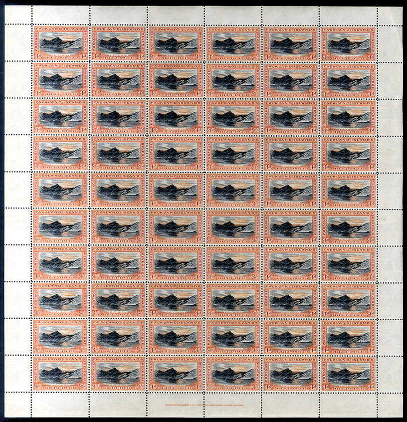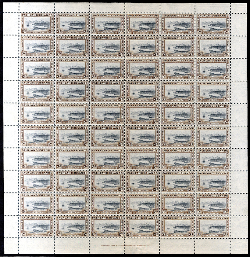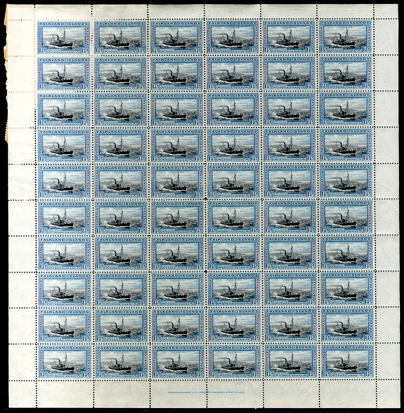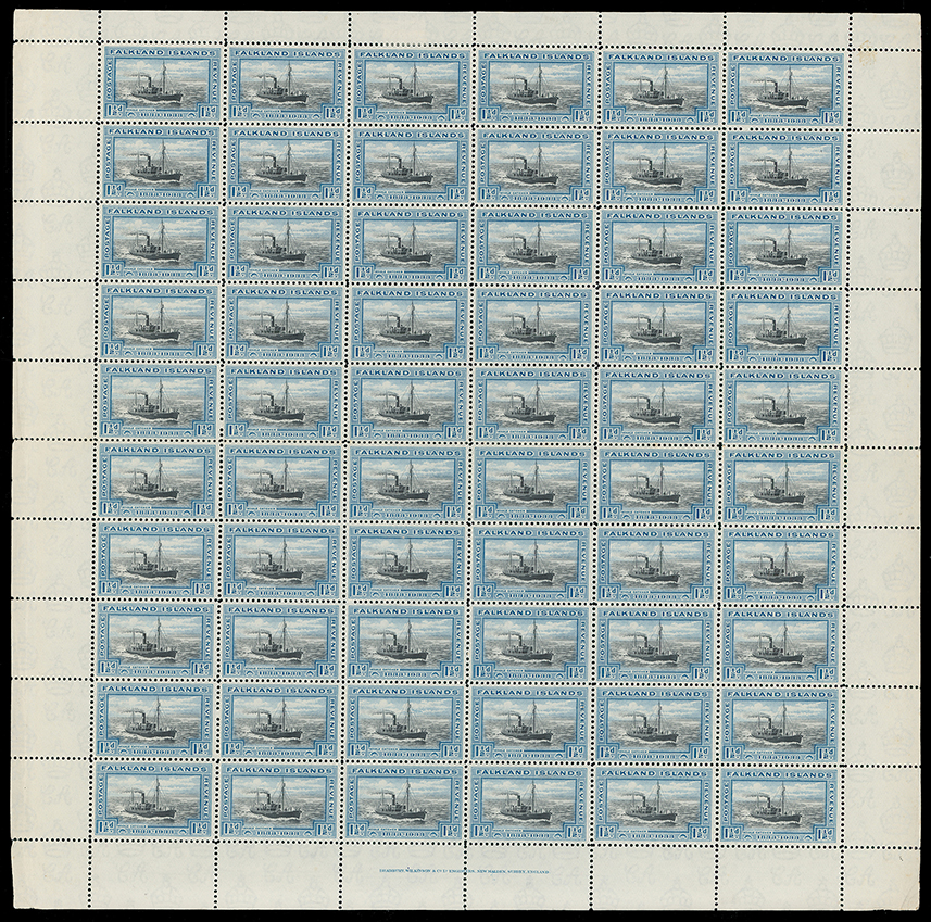Falkland Islands: 1933 Centenary 11/2d. complete mint sheet of 60 with paper adhesions on reverse incl. part block of 1d., three thinned and some separated perfs. otherwise mainly fine and hinged in selvedge only.