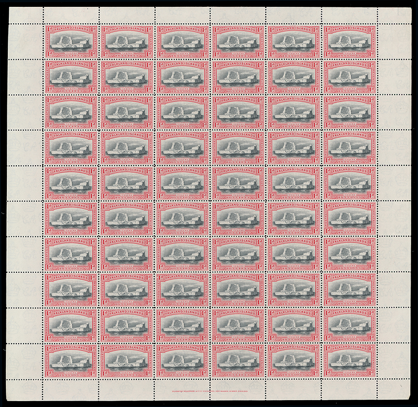 Falkland Islands: 1933 Centenary 1d. complete unmounted mint sheet of 60 incl. thick serif to “1” at left flaw [R. 1/3], fresh and scarce. Ex Spafford, S.G. 128, a, cat. £956+. Photo. (Image1)