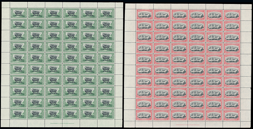 Falkland Islands: 1933 Centenary 1/2d. and 1d. complete unmounted mint sheets of 60, the 1d. incl. thick serif to “1” at left flaw [R. 1/3], fresh and fine. Ex Spafford, S.G. 127, 128, a, cat. £1,196+. Photo. (Image1)