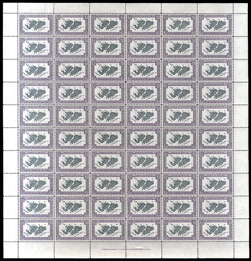 Falkland Islands: 1933 Centenary 3d. complete unmounted mint sheet of 60, some perf. separation, corner bend affects two but fresh and scarce. S.G. 131, cat. £1,680+. Photo. (Image1)
