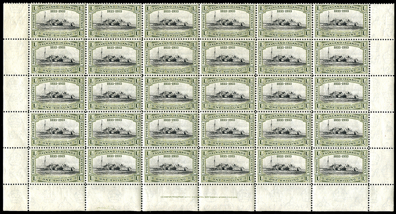 Falkland Islands: 1933 Centenary 1s. unmounted mint lower half sheet of 30 with margins three sides and imprint, some separated perfs. otherwise fine and fresh. S.G. 134, cat. £2,250. Photo. (Image1)