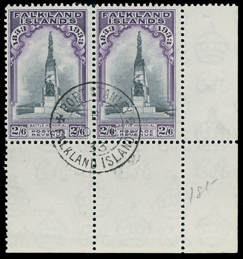 Falkland Islands: 1933 Centenary 2s.6d. lower right corner marginal horizontal pair, first printing, neatly cancelled by favour PS.1A “20 DE/33” c.d.s., fine. S.G. 135, cat. £800. Photo. (Image1)