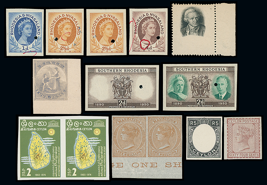 76 imageEssays, Proofs and Specimens: A selection of Commonwealth mainly imperf. proofs on stock cards, incl. Ceylon, Mauritius, Nevis, Rhodesia and Nyasaland, Southern Rhodesia etc., fine. (14) (Image1)