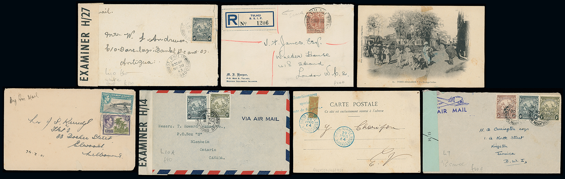 97 c, entire, etc. imagePostal History and Covers: A middle period range of covers and cards, incl. Aden and Barbados W.W.II censored covers, Australia with W.W.I Y.M.C.A. envelopes, British Solomon Islands with 1936 registered cover Tulagi to London franked 41/2d., W.W.II undated covers to Sydney or Geelong endorsed “PASSED FREE/OF POSTAGE”, Czechoslovakia with 1937 death of President Masaryk, Gilbert & Ellice Islands, Madagascar 1904 picture postcard addressed locally and franked vertical bisect 20c. tied by large part “Affranchissement/special/faute de figurines” and Diego Suarez c.d.s., Zanzibar, W.W.I with Australian Y.M.C.A. envelopes, etc. (approx. 110) (Image1)