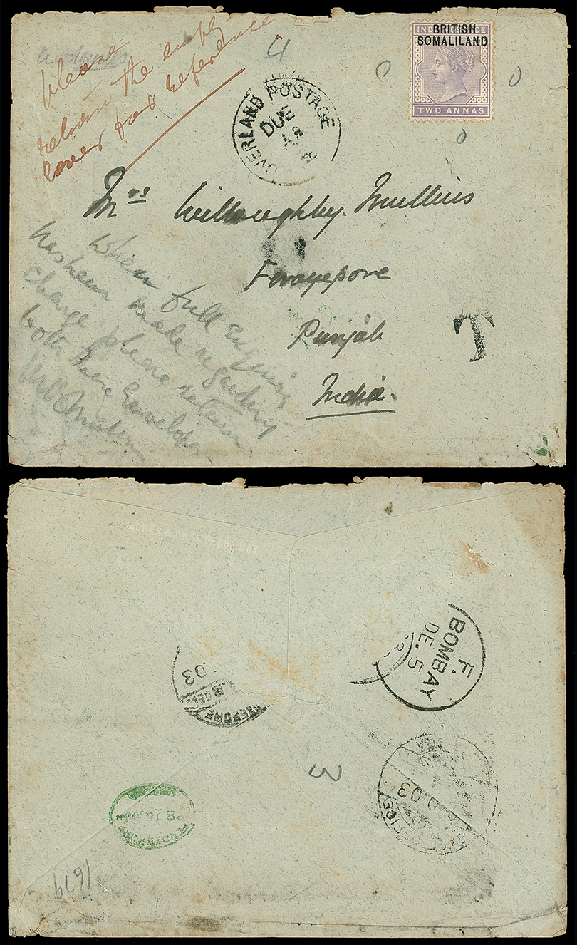 94 c, entire, etc. imagePostal History and Covers: All World selection incl. 1830 letter and 1857 envelope to England written at or from Saint Helena, 1840 entire to London with small arc “GIBRALTAR” in black, 1898 G.B. 21/2d. envelope to Nyasaland, 1903 envelope to India franked British Somaliland 2a. uncancelled, apparently not recognised on military mail and taxed, 1904 envelope to Australia franked Transvaal 1d. block of six, 1906 postcard to England franked India 1a. tied by Bushire squared circle, 1908 Sweden 2öre envelope to Samoa uprated 1öre and 2öre tied by Stockholm c.d.s, 1932 postcard to Austria franked Papua 1d. and 2d. tied by Samurai c.d.s., 1940 censored airmail cover to Sydney franked Palestine 10m. and 50m., 1940 local linen lined parcel tag franked Canada 5c., 20c. and 50c. block of four etc. (62) Photo. (Image1)