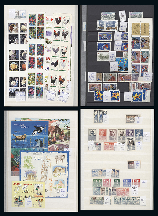 France: An unmounted mint accumulation, incl. 1935 to 1999 lightly duplicated stock in four stockbooks, nearly complete from 1950s onwards, incl. Air Post 1949 1,000f., 1954 set and 1957 1,000f., 1954 National