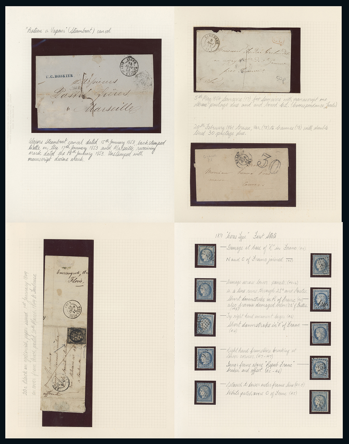 France: A mainly used collection with covers in album, 1814 to 1871, incl. pre-stamp covers 1814 with “TOULOUSE” mark, 1853 from Alger with steamboat c.d.s., 1861 with “30” postage due mark, 1849 20c. on entire