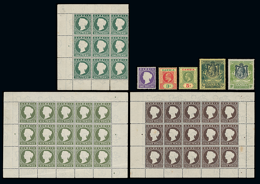 Gambia: A comprehensive mint collection in album, 1880 to 1965, incl. 1880-81 watermark sideways 1/2d. and watermark upright values to 4d. and 6d., 1886-93 set with shades, 4d. and 6d. sheets of fifteen, 1898-1902