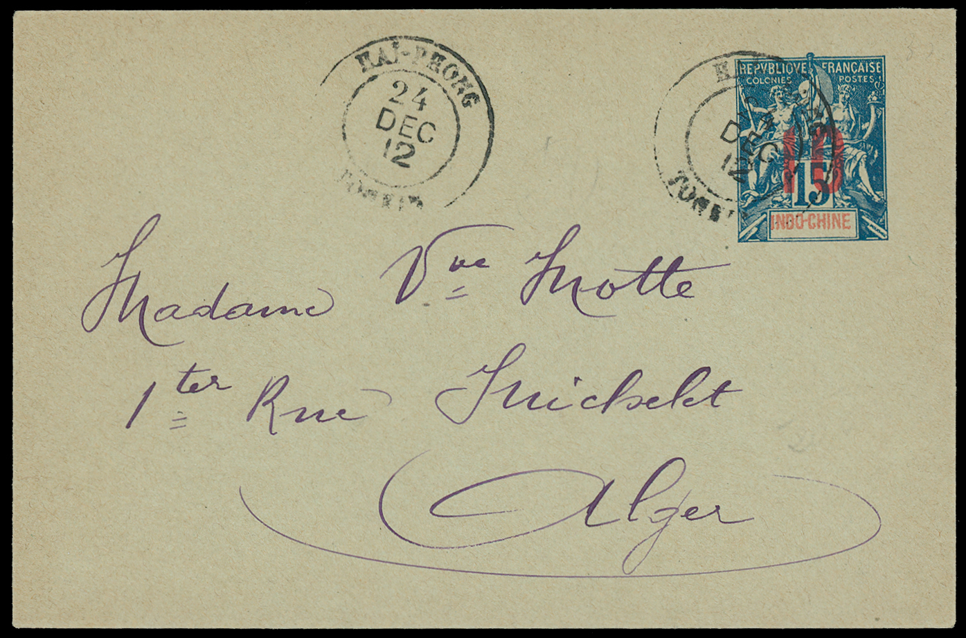 French Post Offices in Indo-China: Selection incl. 1899 5c. lettercard to Hong Kong, underpaid and taxed, 1906 postcard to Algeria franked 5c. tied by Pho-Lang -Thuong Tonkin c.d.s., 1909 ‘red band’ local cover to